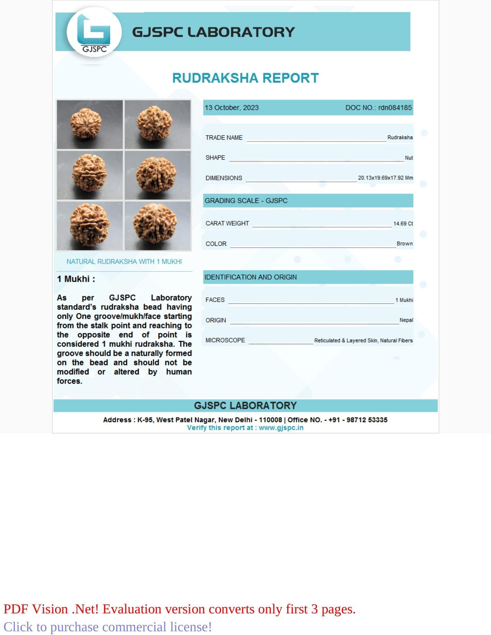 This is a certified 1 Mukhi Rudraksha bead with Certificate No: RDN084185. Known for its strong spiritual energy, this rudraksha is believed to promote concentration, inner peace, and a deep connection with higher consciousness. Ideal for meditation, spiritual growth, and protection from negative energies.