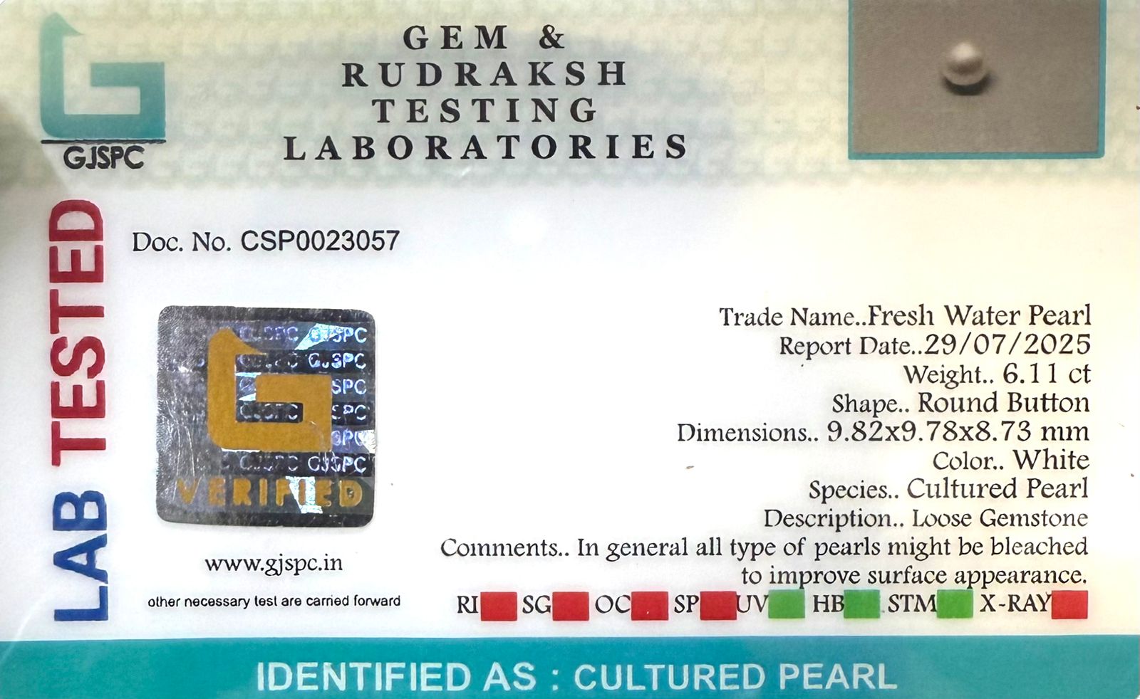 Discover natural elegance with this premium Freshwater Pearl in a Round Button shape, measuring 9.82 x 9.78 x 8.73 mm. With its soft luster, symmetrical form, and smooth finish, this pearl is ideal for high-end jewelry making, including rings, earrings, pendants, or traditional malas. The round button cut offers a modern twist to classic pearl designs—perfect for collectors and designers alike.