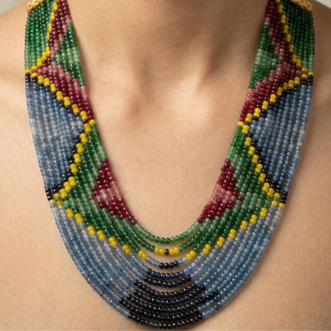 The Multi Mala Semi-Precious Gemstone Beads Mala (11 Lines, 24 Inches) is a luxurious statement necklace designed for those who seek both elegance and positive energy in their everyday style. Crafted with 11 beautifully layered strands of handpicked semi-precious gemstone beads, this multi-strand mala offers a rich, royal look that instantly enhances any outfit, whether traditional or modern. Each bead is carefully polished and arranged to create a balanced, harmonious design, making this 24-inch gemstone mala perfect for festive wear, special occasions, or spiritual styling.